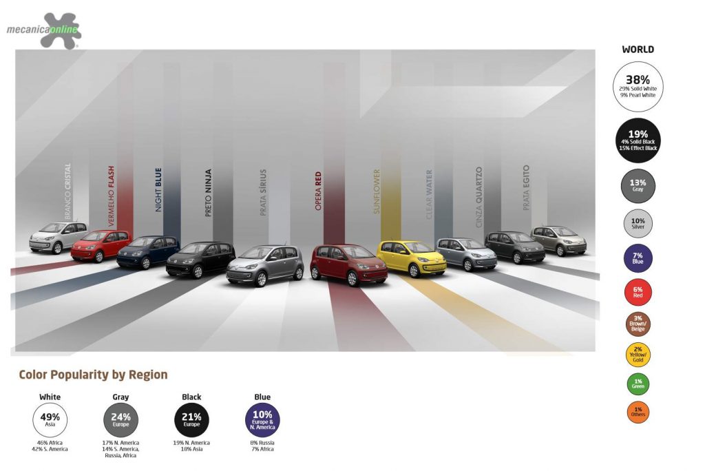 Esses dados foram apresentados no 67º Relatório Global de Popularidade de Cores Automotivas, produzido pela Axalta, que revela quais são as três primeiras: branca (38%), preta (19%) e cinza (13%). Desde 2011, o branco ocupa o topo da lista ao redor do mundo.