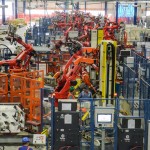 FUNILARIA – Nessa área, está uma inovação projetada e executada exclusivamente para essa planta. Na etapa de projeto da fábrica, foi estabelecido o objetivo de soldar a carroceria em uma única estação. O desafio era aplicar 100 pontos de solda em 60 segundos, congelando a geometria da carroceria em uma única etapa. Normalmente, a fixação das partes e consolidação da carroceria é feita em três estações.