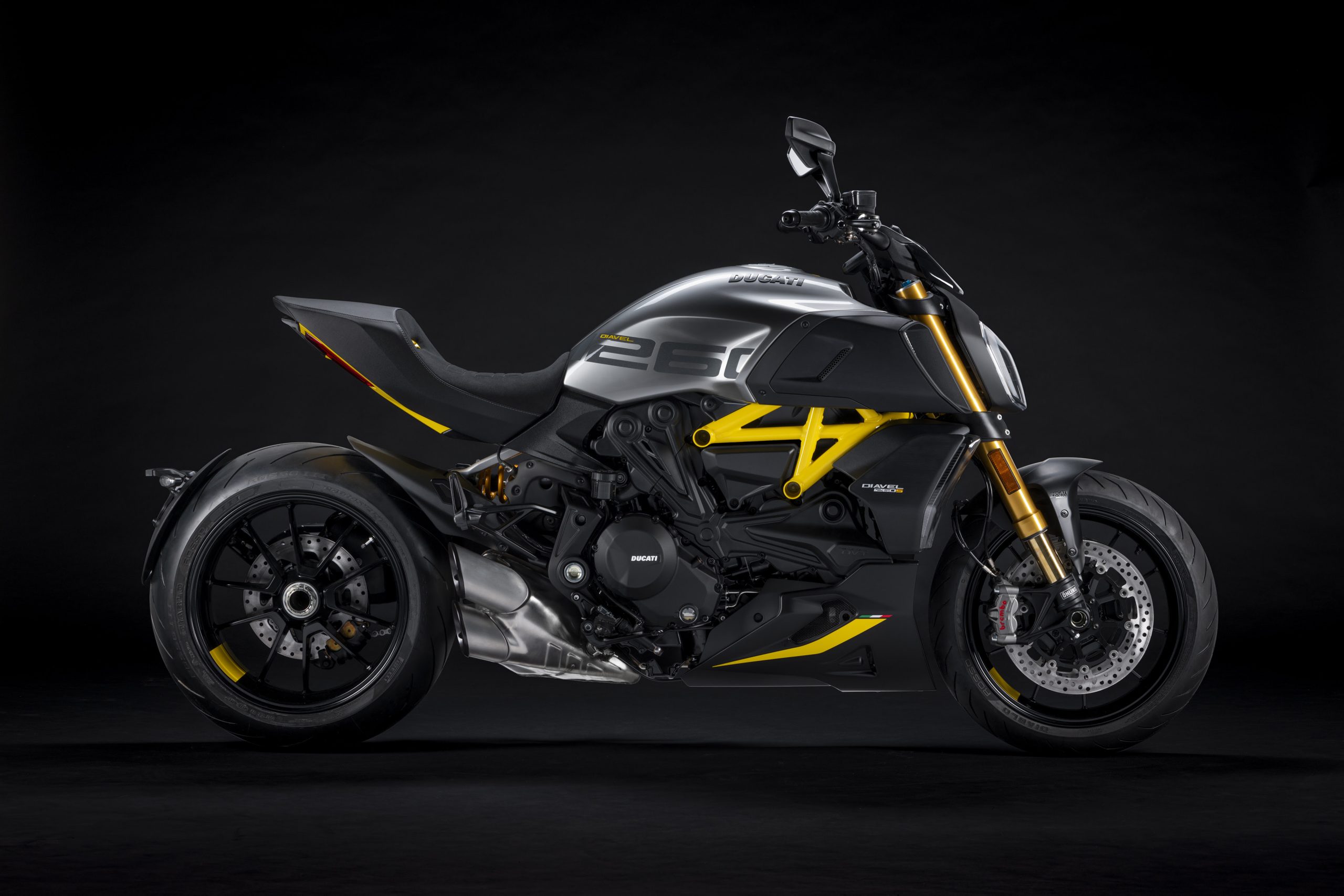 A pintura da Diavel 1260 S “Black and Steel” é caracterizada pela escolha de gráficos assimétricos e refinados que combinam cinza brilhante e preto fosco como cores principais. O diferencial fica por conta da cor amarela, que confere toques esportivos ao quadro, à parte inferior da rabeta e alguns acabamentos da moto.