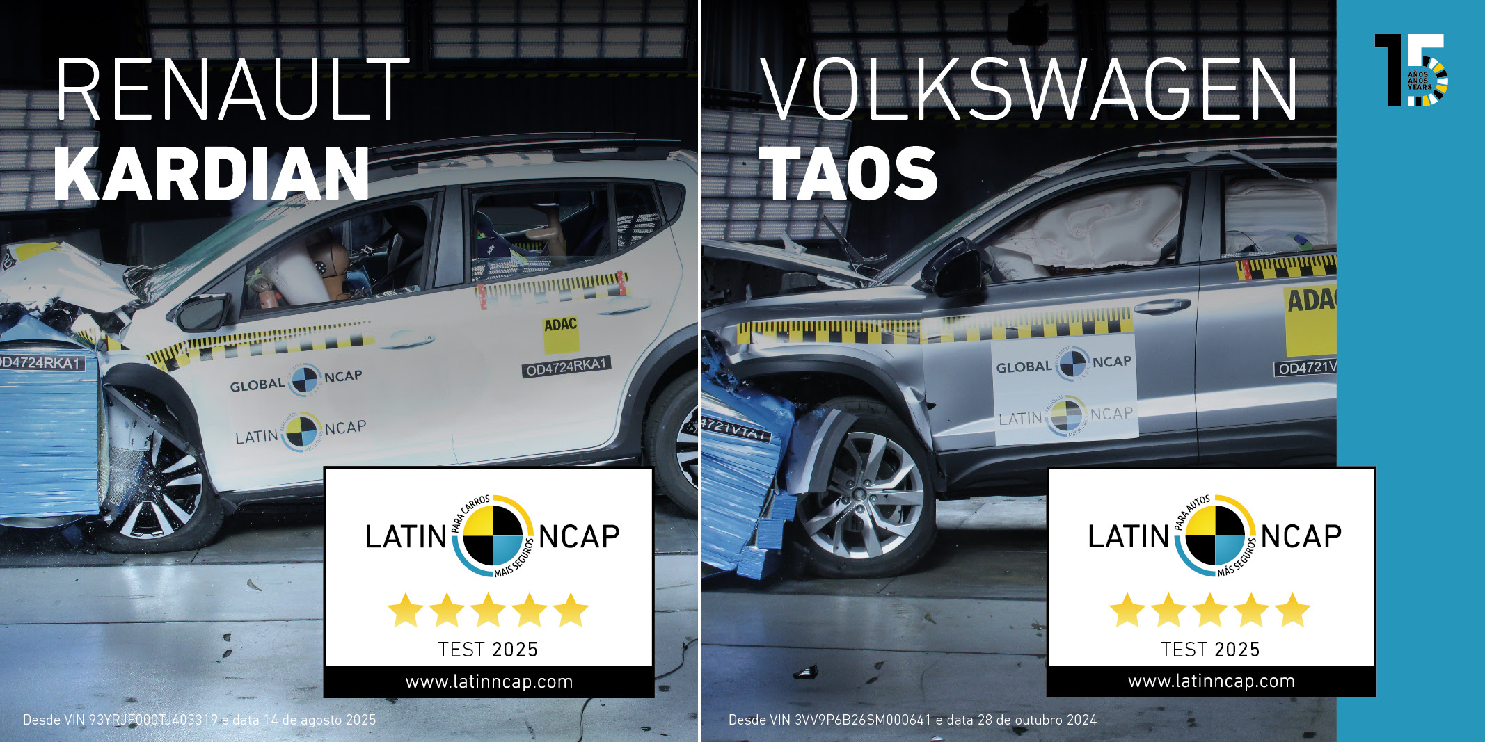 “Parabéns à Renault por seu primeiro resultado de cinco estrelas no Latin NCAP. Seu compromisso com veículos mais seguros ficou claro ao melhorar um modelo popular como o Kardian de quatro para cinco estrelas em tão pouco tempo. O Latin NCAP aguarda ansiosamente os novos modelos da Renault e as próximas cinco estrelas da marca. A renovação do Taos confirma mais uma vez a política de segurança máxima da Volkswagen e seu compromisso constante em mostrar suas conquistas aos consumidores. O Taos é o primeiro modelo a obter cinco estrelas duas vezes sob os mesmos protocolos de avaliação, após uma renovação e atualização. É importante que os consumidores recebam informações independentes sobre segurança para tomar decisões ao comprar seu próximo veículo. O Latin NCAP insta todos os governos a implementar uma rotulagem obrigatória com classificação por estrelas para que as informações ao consumidor estejam disponíveis para todos os compradores de veículos e gestores de frotas.”