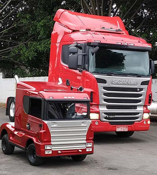 Os carrinhos também têm partida elétrica, caixa de direção, freios a disco, display digital de marcha, faróis, buzina e os modelos mais sofisticados, caso dos mini trucks, trazem ainda câmera de ré, som MP5 e interior com revestimento em alcantara (aquele tecido que parece uma camurça, comum na Lamborghini). Aliás, os carrinhos podem ser customizados ao gosto e necessidade do cliente.